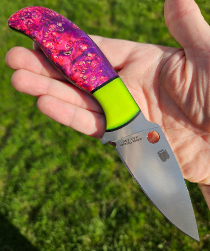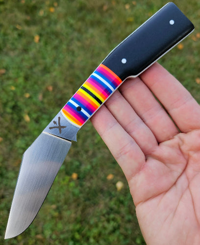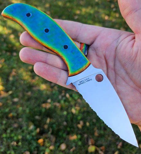 The Arc and Iron Flux is an amazing knife. The ergonomics are beyond good. I have medium sized hands and if I welded the Flux to my hand I would never spend a day in discomfort. The design and materials used make this an art piece worthy of a frame. The tiffany blue and cherry red pop hard. My girl said this is her favorite knife. Its balanced more like a fighter being more handle heavy. The blade has an awesome acid washed finish and came really sharp. Very slicey. I usually find things to nit pick, but this knife is beyond reproach. Thank you Jordan!