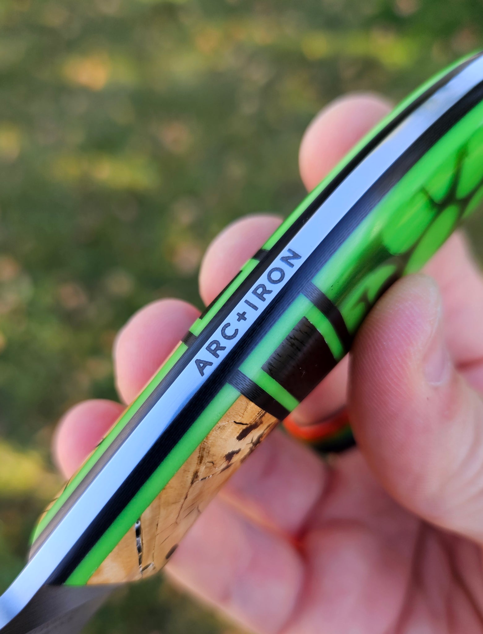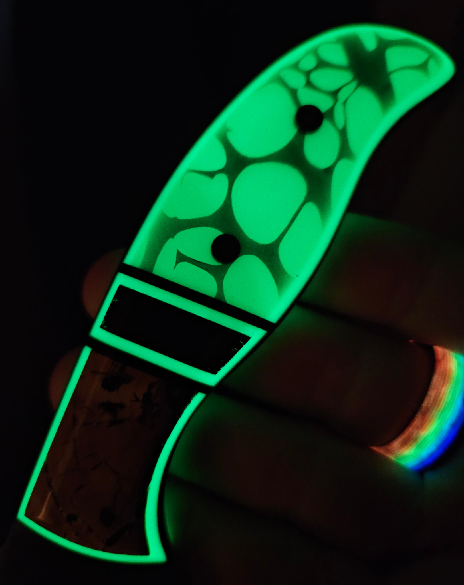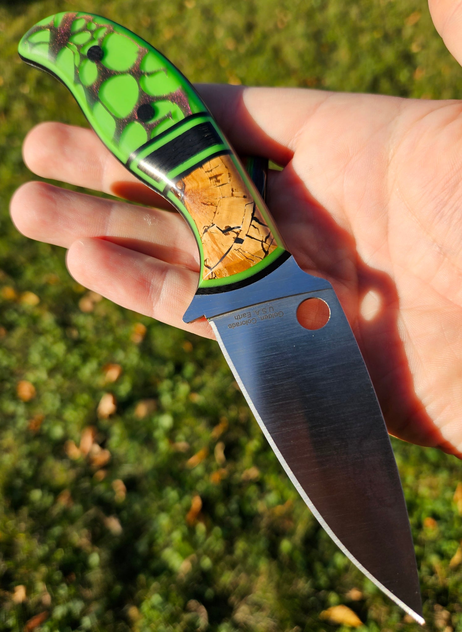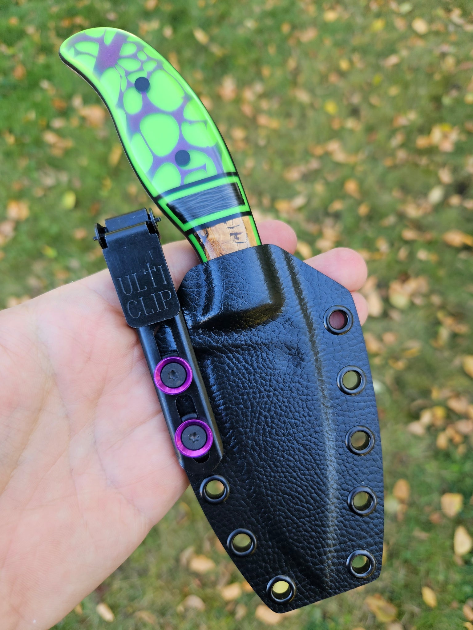 This is a wild one! Spyderco MagnaMax Mule at 65 HRC (tested) featuring handle scales made from stabilized Mammoth Tusk/CF/Resin/glow in the dark green liners. Comes with matching kydex sheath with Ulti Clip for secure front pocket retention/carry. Also comes with custom flight tag style leather strop loaded with green compound.