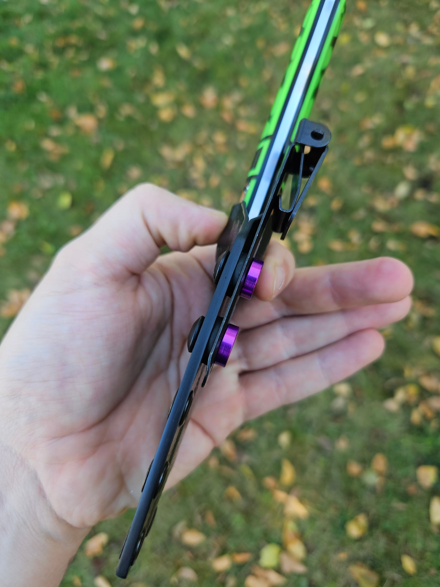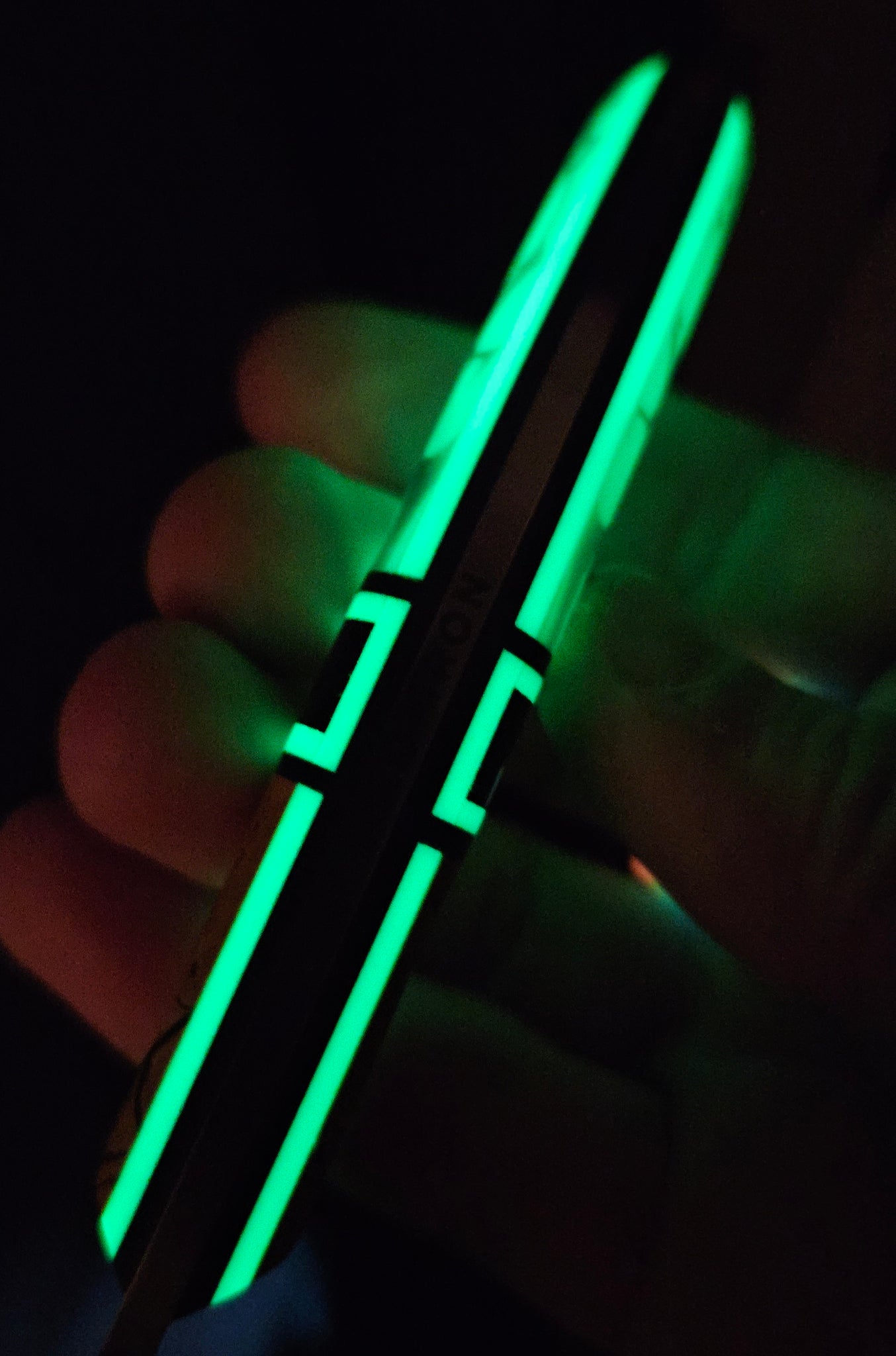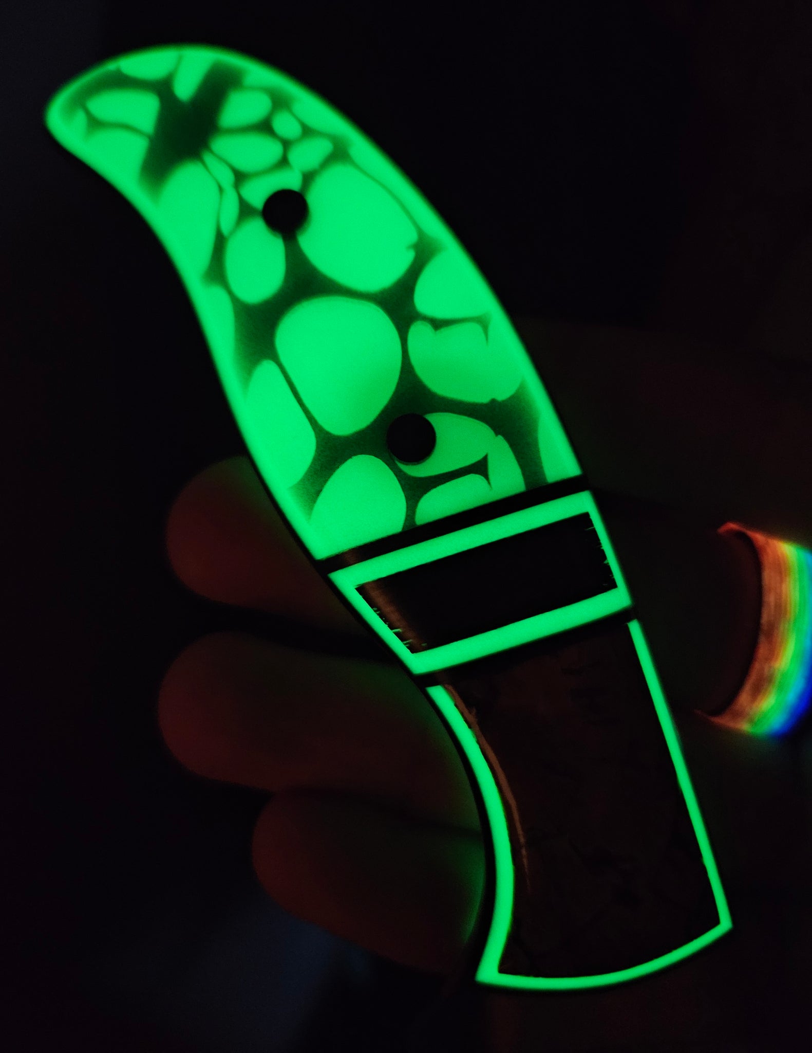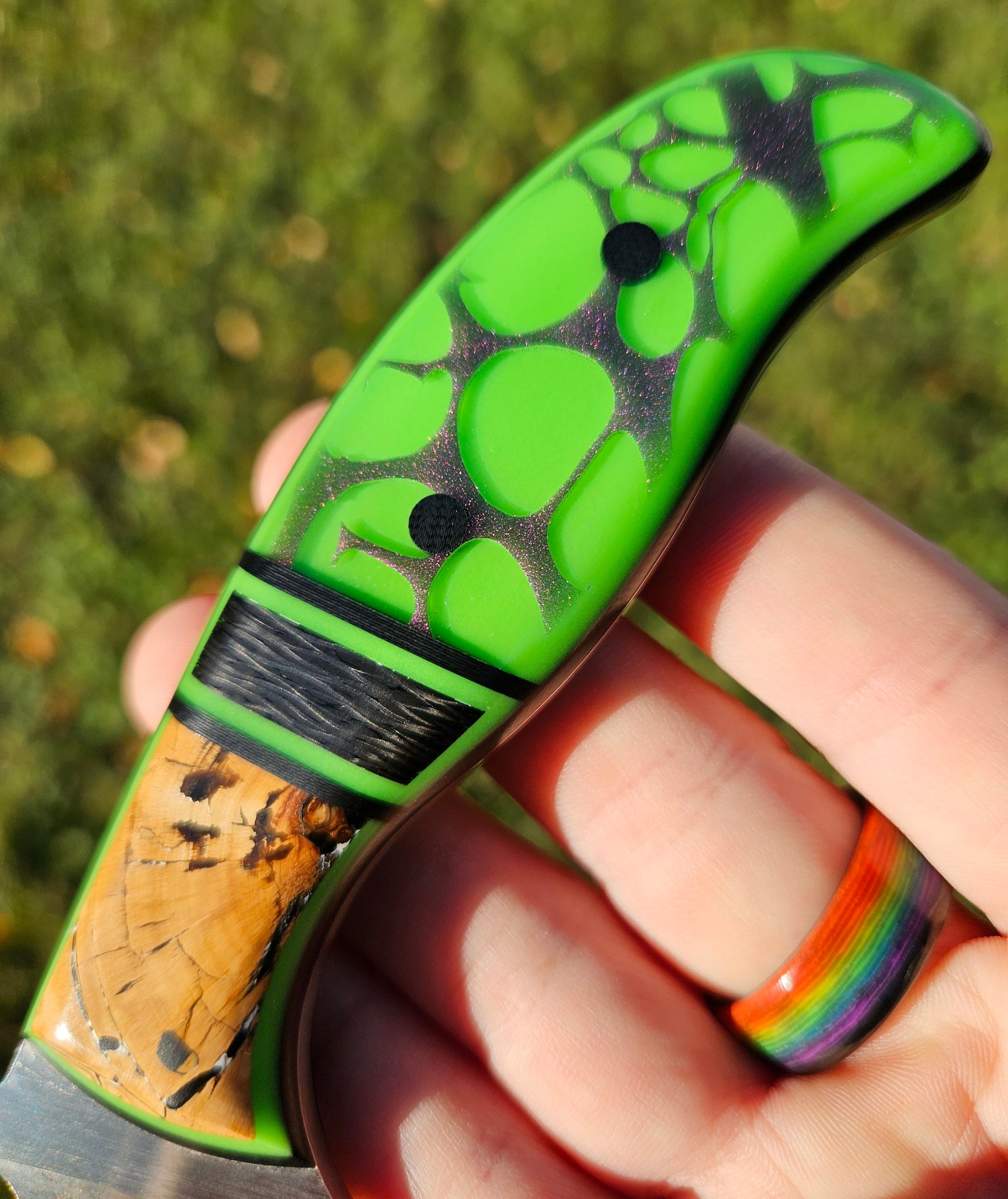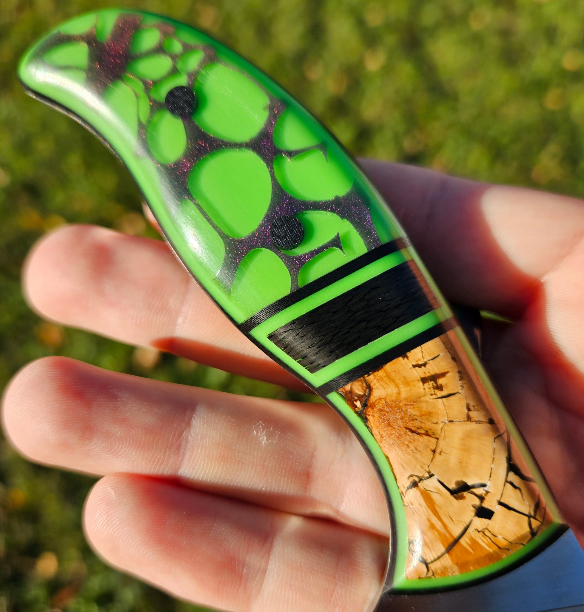 This is a wild one! Spyderco MagnaMax Mule at 65 HRC (tested) featuring handle scales made from stabilized Mammoth Tusk/CF/Resin/glow in the dark green liners. Comes with matching kydex sheath with Ulti Clip for secure front pocket retention/carry. Also comes with custom flight tag style leather strop loaded with green compound.